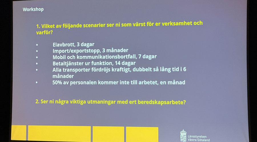 Flera nationella och regionala röster medverkade också under dagen. Vi fick lyssna till Madeleine Sjöstedt, generaldirektör för Svenska institutet, som bidrog med internationella perspektiv på Sveriges roll i en föränderlig omvärld. Jörgen Peters, länsöverdirektör vid Länsstyrelsen Västra Götaland, belyste regionens förutsättningar kopplat till beredskap och långsiktig utveckling. I ett fördjupningspass ledde beredskapshandläggare Matthias Johansson på Länsstyrelsen ett samtal, med fokus på samverkan mellan kommuner och företag, om näringslivets roll i att bygga ett robust samhälle. Näringslivets perspektiv lyftes bland annat av representanter från Airon, Hemtrevligt och Gunnar Dafgårds. Dagen modererades av Jon Forssell.